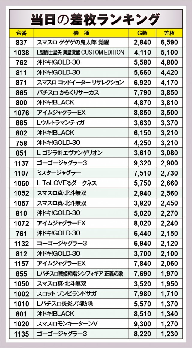 スマスロ機・沖スロの活躍はもちろんだが、上表には『ジャグラー』シリーズの名前も多く名を連ねているのが鮮烈だ。いずれもファンが打ち込んでいた様子が見られ、その中で『スマスロ ゲゲゲの鬼太郎 覚醒』『L聖闘士星矢 海皇覚醒 CUSTOM EDITION』が大台を突破する熱気を披露。他の台もコンスタントに大当りを重ねており、ファンは有意義な時間を過ごしていたことだろう。