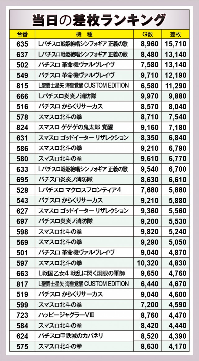 上表の優秀機種たちは、いずれもポテンシャルを秘めていた。その中で『Lパチスロ戦姫絶唱シンフォギア 正義の歌』は2台の万枚OVERを生み出し、大きな活気とともに店内の盛り上がりをリード。スマスロ以外にもメダル機『パチスロ炎炎ノ消防隊』が活躍し、さらには『ジャグラー』シリーズもコンスタントなボーナス当選を披露していたのが見て取れる。