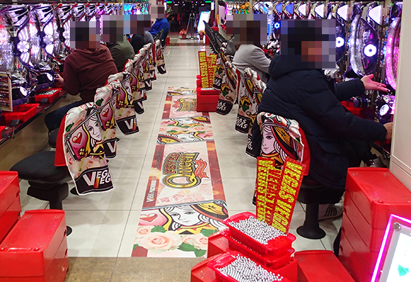 14時をまわった頃の4円パチンコでは前日に引き続き、「CRフィーバークィーン」が人気。明るい表情で遊技をおこなっているプレイヤーもみられ、楽しい時間を過ごせていることが伝わってきた。