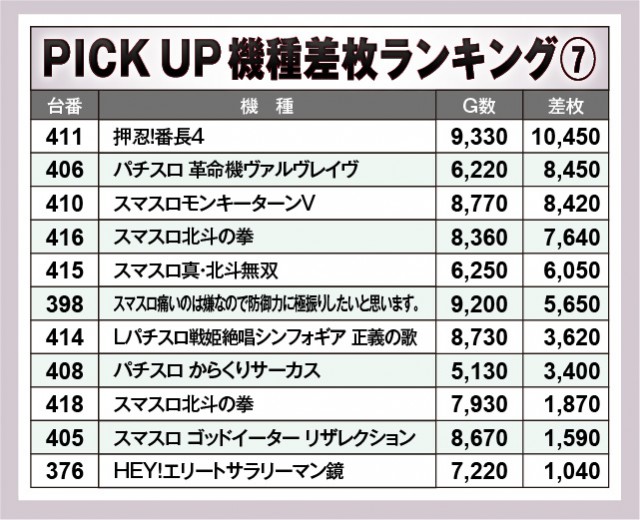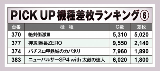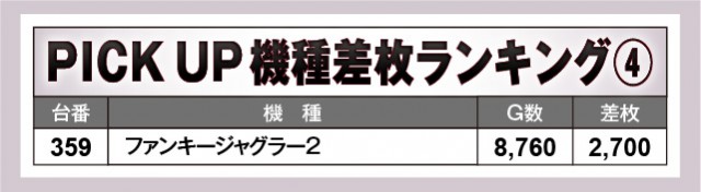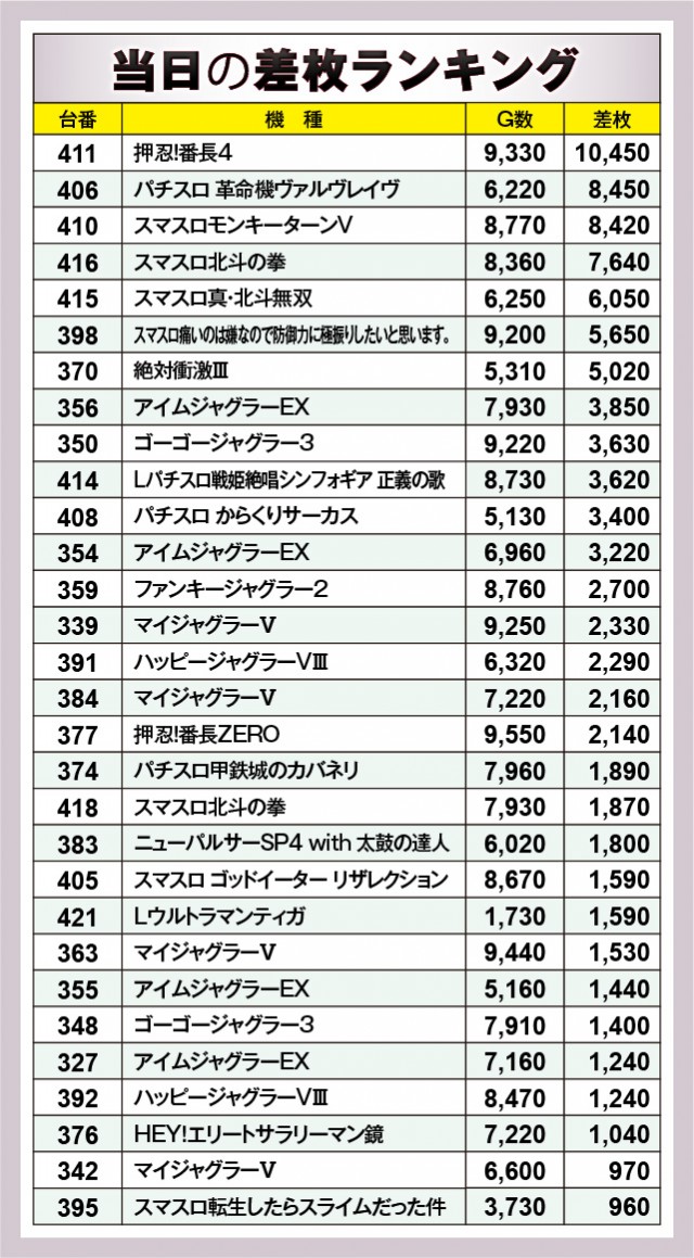 『押忍!番長4』にて万枚OVERが発生すれば、『パチスロ 革命機ヴァルヴレイヴ』『スマスロモンキーターンV』という絶対的な機種からも8,000枚OVERが生まれている。その中で『絶対衝激Ⅲ』が5,000枚OVERと食い込んでおり、メダル機ながら気迫を見せていたのが印象的だ。ほかにも『ジャグラー』シリーズが存在感を放っており、館内全体が盛り上がった1日になった。
