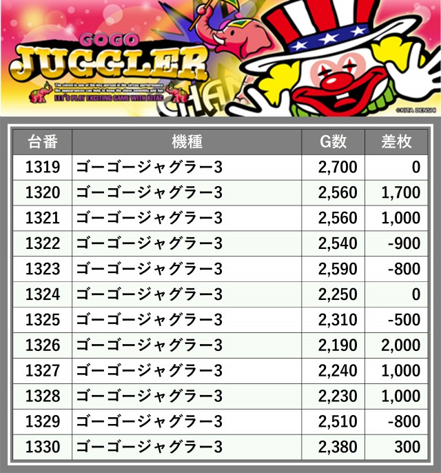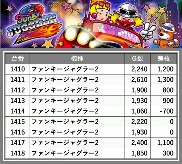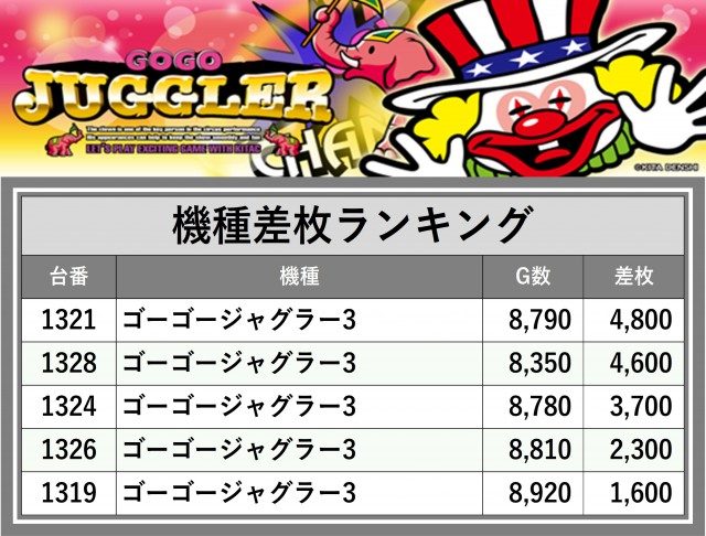 厳選された取材対象機種をはじめ、その他スロット全体から好記録が飛び出した!プレイヤーが楽しんだ1日を下記データにて振り返ってみて欲しい。