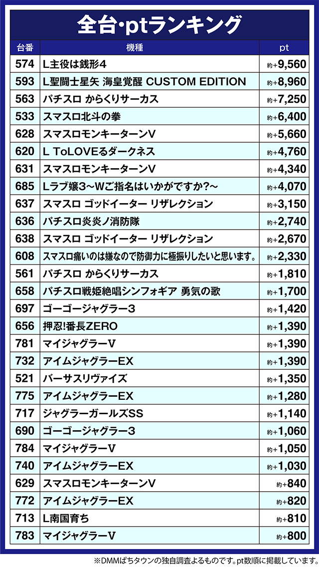 563番台の「パチスロ からくりサーカス」と628番台の「スマスロモンキーターンV」も、約+5,500ptを上回った。