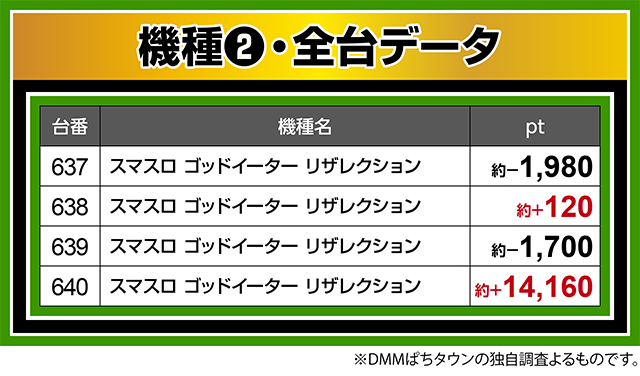 『スマスロ ゴッドイーター リザレクション』も活気が大きく、640番台が約+14,160pt!