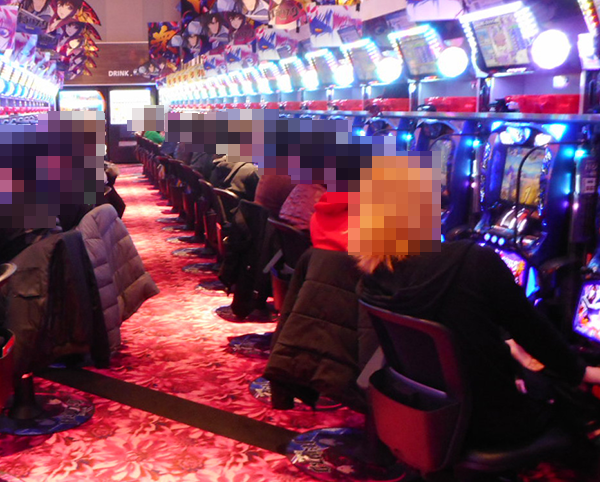 朝イチの20円パチスロでは、「パチスロエウレカセブンAO」や「バジリスク~甲賀忍法帖~絆」など、多数の機種が満席。