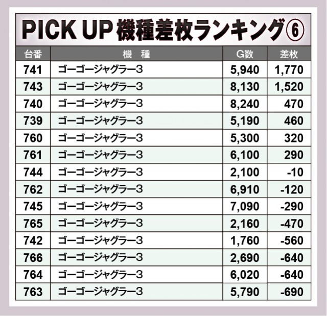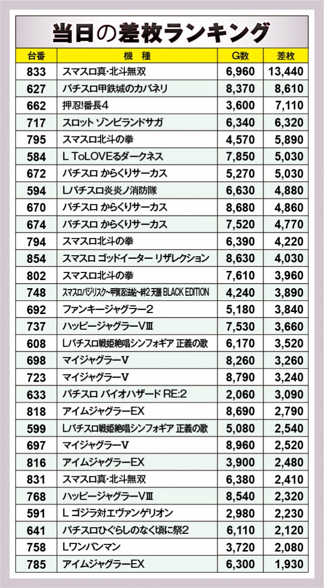 『スマスロ真・北斗無双』から万枚OVERが発生しており、当日の館内の盛り上がりをリードする存在となっていた。ほかにも大台突破台が多く生まれているが、それ以上に印象的なのは『ジャグラー』シリーズが多く名を連ねていることだろう。上表だけでも9台を確認でき、いずれも回転数と差枚数が比例する展開を披露していたのが鮮烈だ。