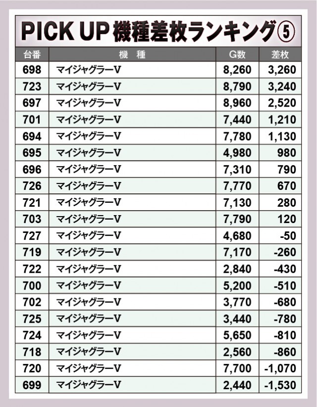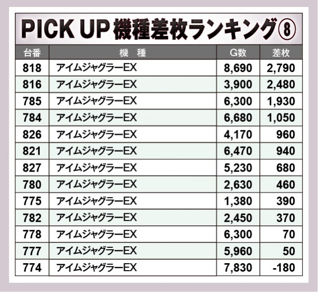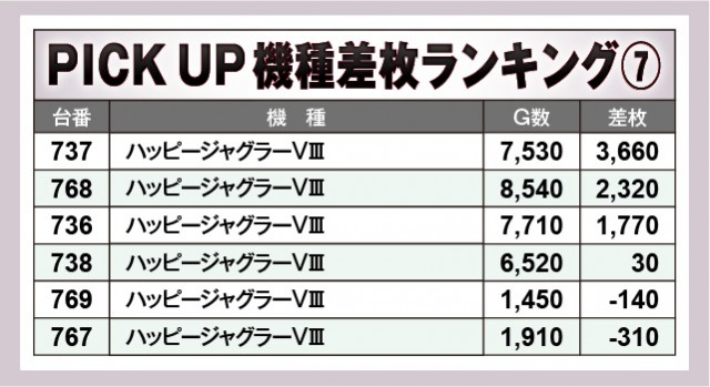 前述でも触れたように、同店に設置された『ジャグラー』シリーズは100台になった。『マイジャグラーⅤ』『ゴーゴージャグラー3』『ハッピージャグラーVⅢ』『アイムジャグラーEX』はいずれも閉店まで打ち込まれた形跡が見られ、差枚数も右肩上がりに伸びていたのが何よりも目に焼きつく。