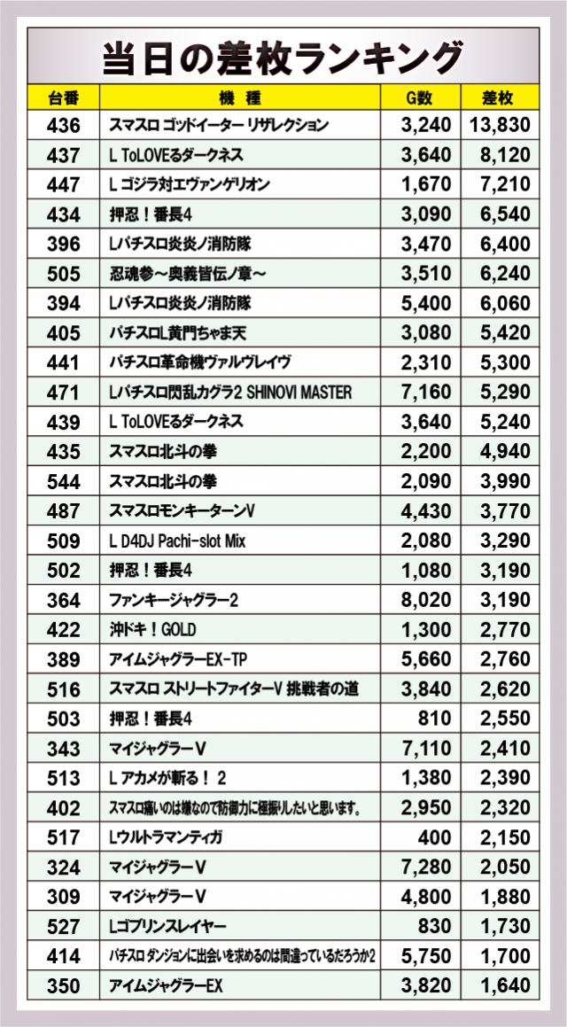 上表をご覧の通り、『スマスロ ゴッドイーター リザレクション』から万枚OVERが発生!さらに『L ToLOVEるダークネス』で+8,000枚OVER、『L ゴジラ対エヴァンゲリオン』で+7,000枚OVERをマーク、そのほかにも多くの台でまとまった出玉を獲得していたのが印象的だ。各所でファンが手応えを感じていたのは間違いなく、有意義な時間を過ごし、同店の魅力に触れたと言って過言ではない。