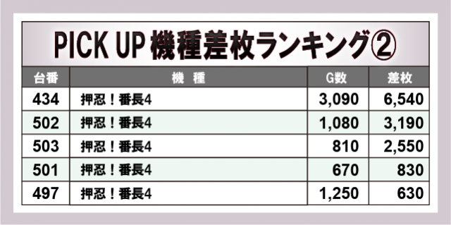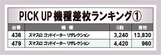 機種単位での活躍を見ると、上表のスマスロ機人気機種たちが大きな活気で店内の盛り上がりをリード。いずれもプラス4桁台が目立っており、コンスタントなボーナス当選を披露していたのが見て取れ、ファンが可能性を見出していた様子が窺える。