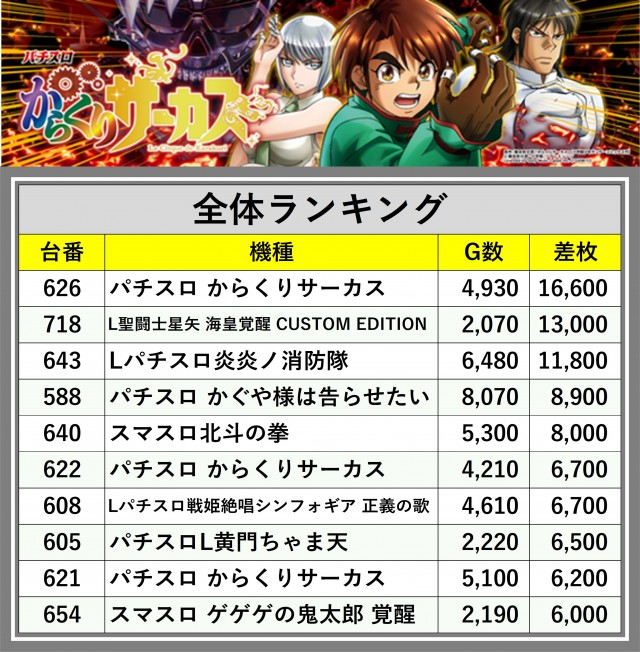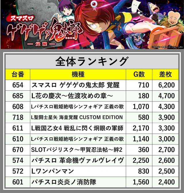 厳選された取材対象機種をはじめ、その他スロット全体から好記録が飛び出した!プレイヤーが楽しんだ1日を下記データにて振り返ってみて欲しい。