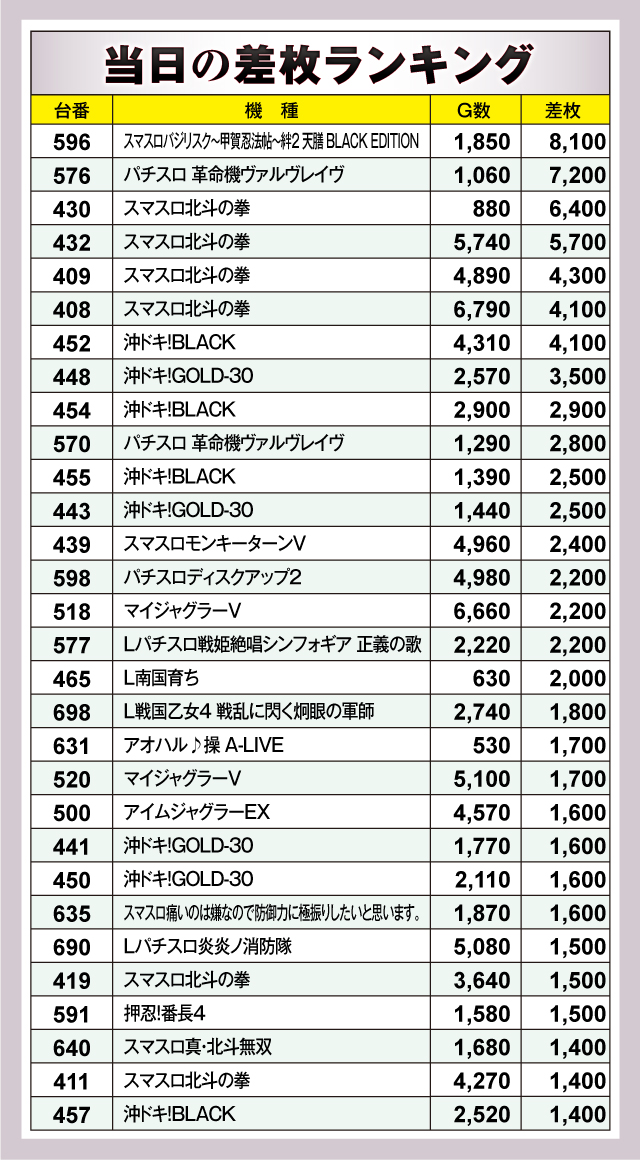 まずは差枚ランキングのチェックから。30台のうち17台が+2,000枚オーバーで、+3,000枚オーバーは8台出現。それらのなかでもっとも優秀だったのは596番台の「スマスロバジリスク~甲賀忍法帖~絆2 天膳 BLACK EDITION」で、差枚は+8,100枚を獲得! またランクイン機種を見渡してみると、「スマスロ北斗の拳」など人気が高い機種のほか、沖ドキシリーズが多数ランクイン。多種多様な機種にチャンスが盛りだくさんだったようだ!