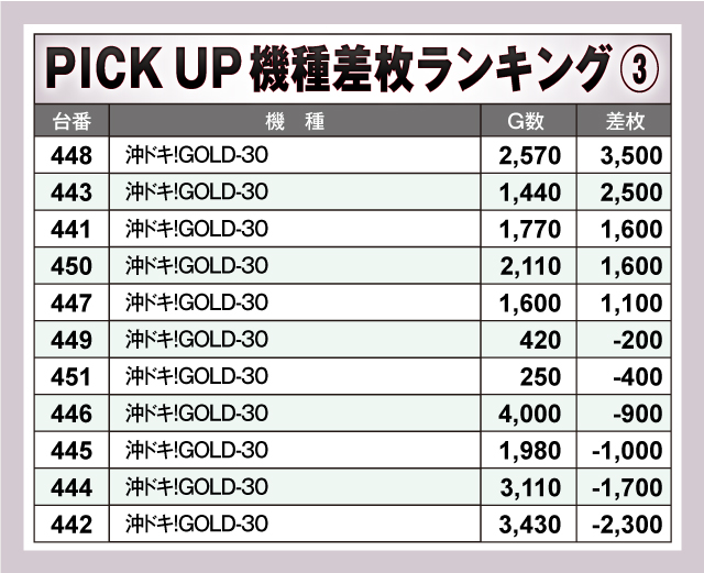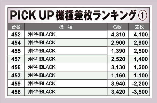 続いては、当日とくに盛り上がっていた3機種を紹介。3機種すべてがトータルプラスをマークしており、とくに「沖ドキ!BLACK」は、ピックアップした8台のうち6台がプラス終了で、そのうち3台が+2,000枚オーバーのプラスと素晴らしい結果を残していた! もちろんその他の2機種からも良台を多数確認できたので、これらの機種たちが当日の店内を盛り上げていたのは間違いなさそうだ!