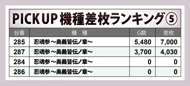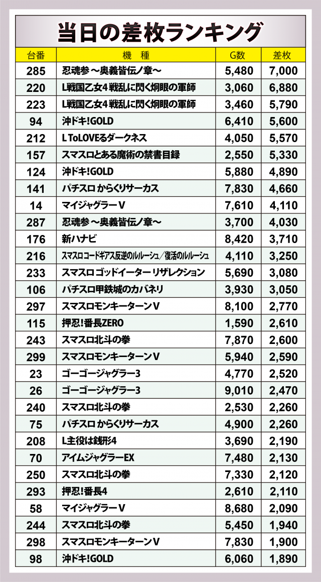 最多枚数を叩き出したのが『忍魂参 ~奥義皆伝ノ章~』で、+7,000枚超&+4,000枚超が1台ずつと、ビッグヒットが続出。