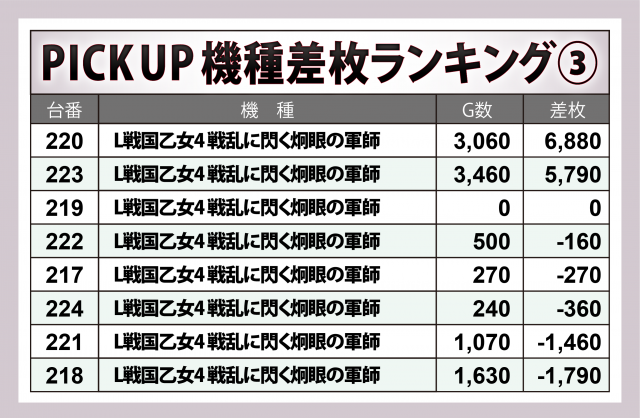 また 『L戦国乙女4 戦乱に閃く炯眼の軍師』も負けていない。+6,900枚弱&+5,800枚弱が1台ずつと、『忍魂』に匹敵するスコアをマーク。
