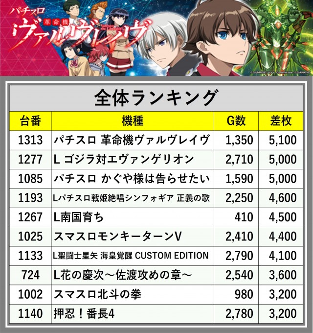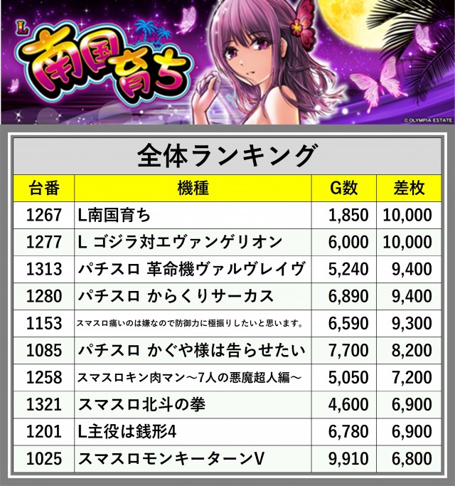 厳選された取材対象機種をはじめ、その他スロット全体から好記録が飛び出した!プレイヤーが楽しんだ1日を下記データにて振り返ってみて欲しい。