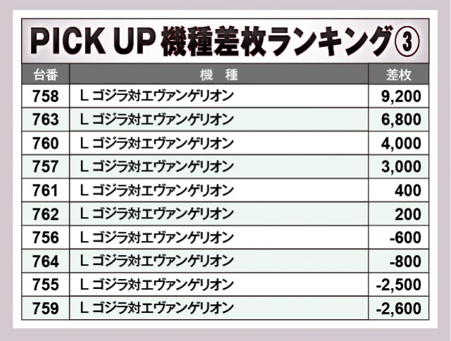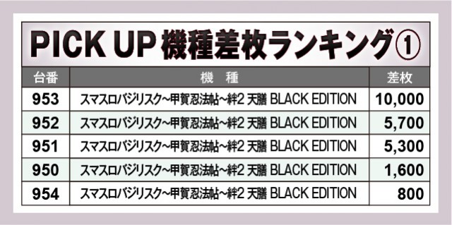『スマスロバジリスク~甲賀忍法帖~絆2 天膳 BLACK EDITION』は全台プラス差枚数を達成しており、いずれもポテンシャルを秘めていた様子が如実に窺える。そして『L ゴジラ対エヴァンゲリオン』『L聖闘士星矢 海皇覚醒 CUSTOM EDITION』も半数以上が活躍し、さらに大台突破ばかりとなっているのが大きな点だ。遊技していたファンの満足度が高いエリアとなっており、同店の魅力に触れられたと言って過言ではない。