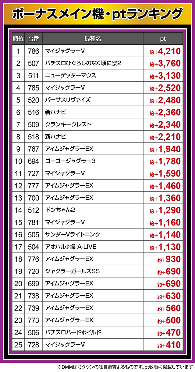 『ゴーゴージャグラー3』の694番台や『ドンちゃん2』の512番台なども約+1,200pt以上と、多くの台が結果を残した。