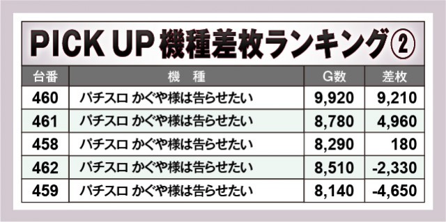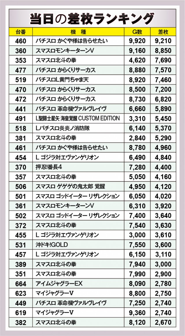 『パチスロ かぐや様は告らせたい』は惜しくも万枚を逃す格好となったが、9,000枚台と大きな熱気を放っていた。ほかにも『スマスロモンキーターンV』『スマスロ北斗の拳』『パチスロ からくりサーカス』が活躍し、ファンは右肩上がりに伸びる出玉に恍惚の表情を浮かべていたことだろう。開店でも手応えを感じていた様子が見と取れるばかりで、多くのファンが有意義な時間を過ごしていたはずだ。