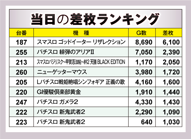 今回も大台達成こそなかったものの、『スマスロ ゴッドイーター リザレクション』のトップ差枚獲得や、『パチスロ 緋弾のアリアⅡ』の連続ランクインなど、素晴らしい結果を見せてくれた。そして『ニューゲッターマウス』の安定した出玉や、『パチスロ 新鬼武者2』の2台同時ランクインなど、今後に期待させてくれる機種も非常に多い。機種のタイプを問わず勝負に挑める。希望を抱きながら閉幕した1日となった。