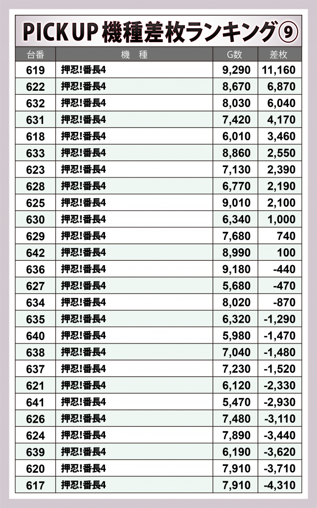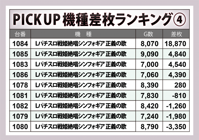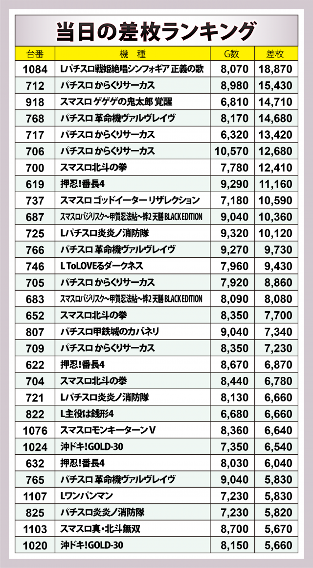 中でも『シンフォギア正義』では+18,900枚弱と全495台の頂点に輝き、『からくりサーカス』では万枚突破が3台&+8,900枚弱・+7,200枚超が1台ずつと、『絆2BLACK』では+8,100枚弱と、シマ全体で驚異的な状態となるマシンが相次いだ。