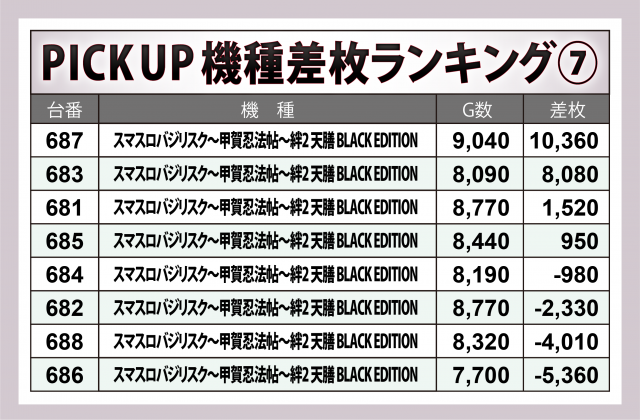 10機種の中で万枚を達成したのが『Lパチスロ戦姫絶唱シンフォギア 正義の歌』『パチスロ からくりサーカス』『パチスロ 革命機ヴァルヴレイヴ』『押忍!番長4』『スマスロ ゴッドイーター リザレクション』『スマスロバジリスク~甲賀忍法帖~絆2 天膳 BLACK EDITION』『Lパチスロ炎炎ノ消防隊』と7つにビッグヒットが生じるハイクオリティ。