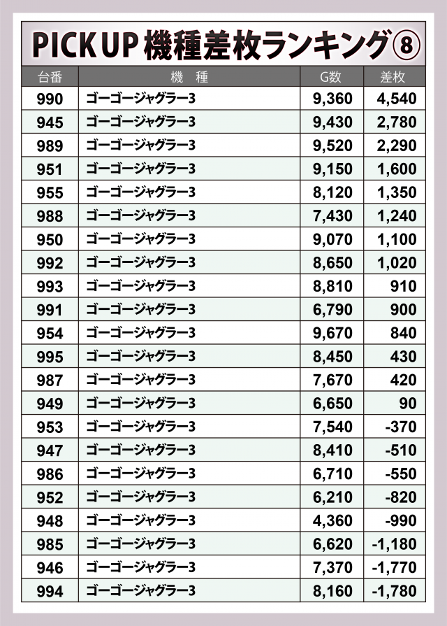 まずは優秀30台の結果から。なんと30台の全てが+5,500枚を超えるハイグレードを誇り、+6,000枚以上は全体の8割超となる25台、+7,000枚以上は全体の6割となる18台、+8,000枚オーバーは全体の半数となる15台、+9,000枚オーバーは13台、そして万枚をクリアしたのが11台と、とんでもないレベルの高さを見せつけた。