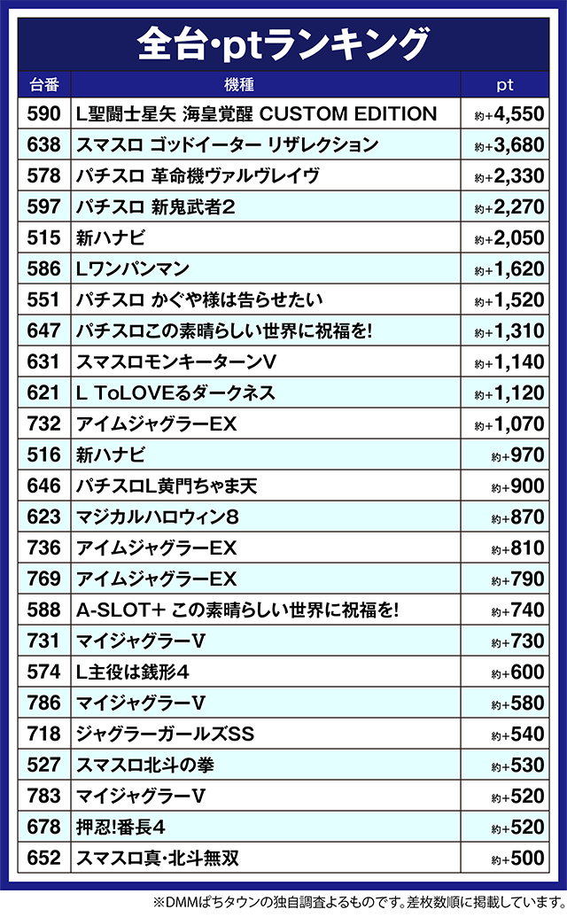 590番台の「L聖闘士星矢 海皇覚醒 CUSTOM EDITION」は約+4,500pt以上、638番台の「スマスロ ゴッドイーター リザレクション」は約+3,600ptをオーバー。