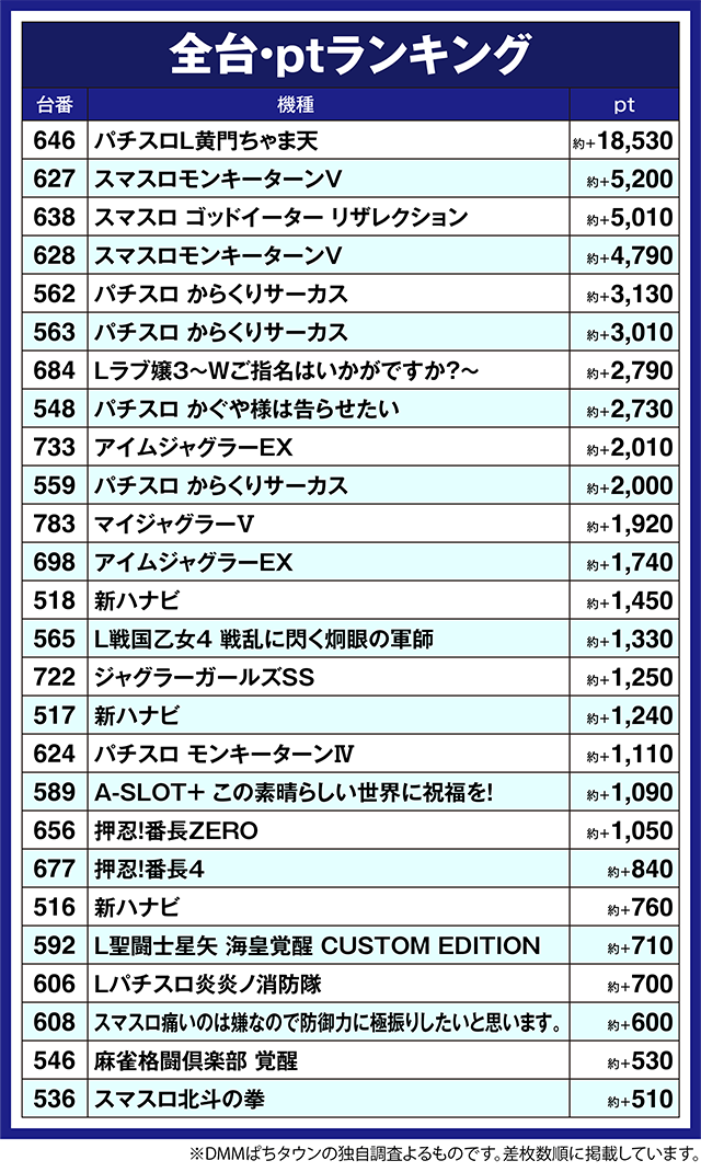 「パチスロL黄門ちゃま天」の646番台が約+18,500ptオーバー。