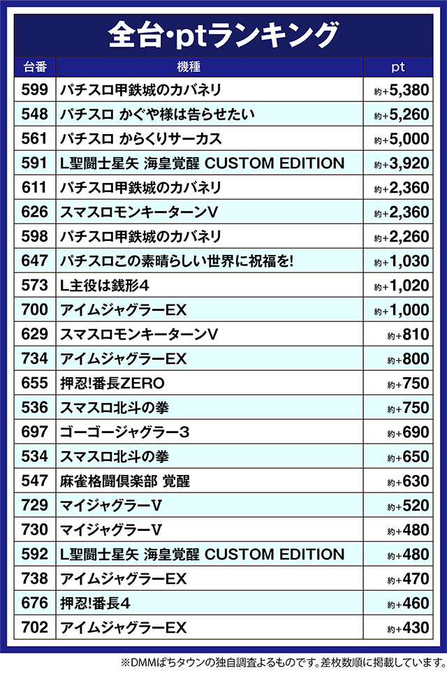 ほかにも、「スマスロモンキーターンV」の626番台や「パチスロこの素晴らしい世界に祝福を!」の647番台など、複数台が約+1,000ptを超えた。