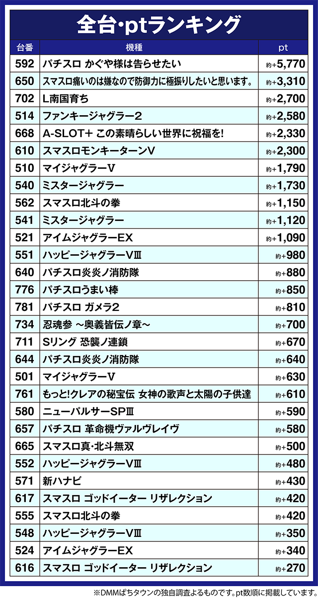 「ミスタージャグラー」は、540番台と541番台が並んで約+1,100ptを上回った。
