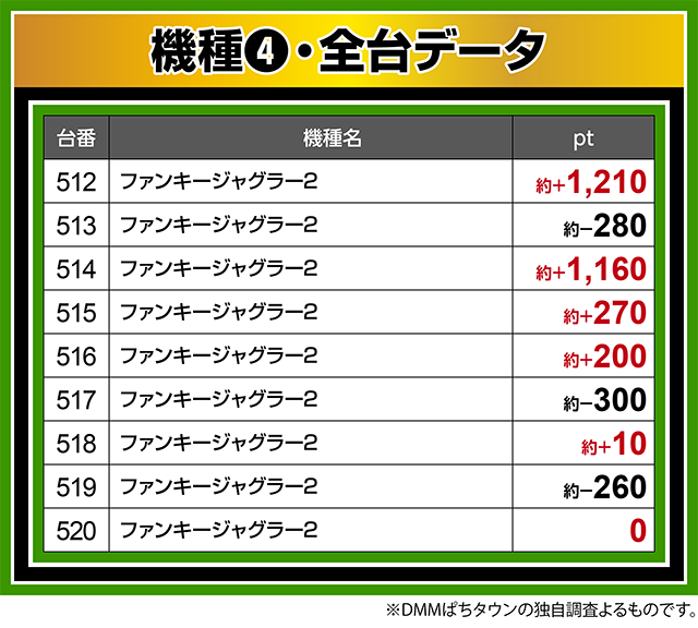 『ファンキージャグラー2』も複数台がプラスとなり、512番台が約+1,200ptオーバー。