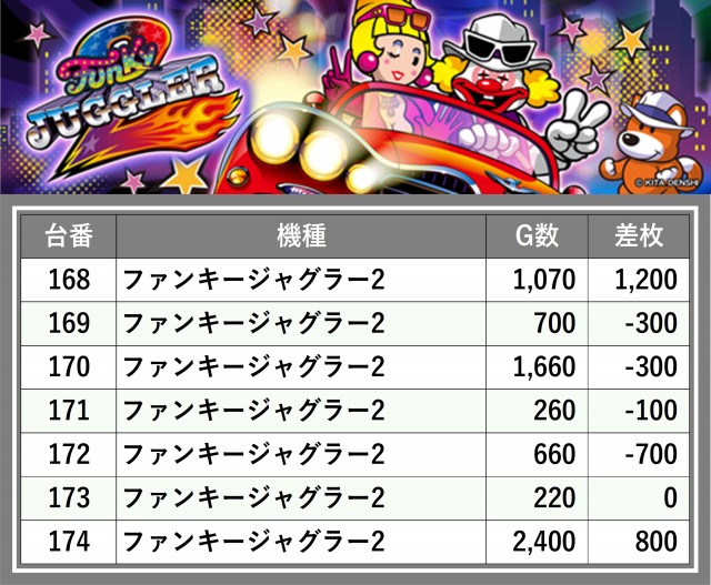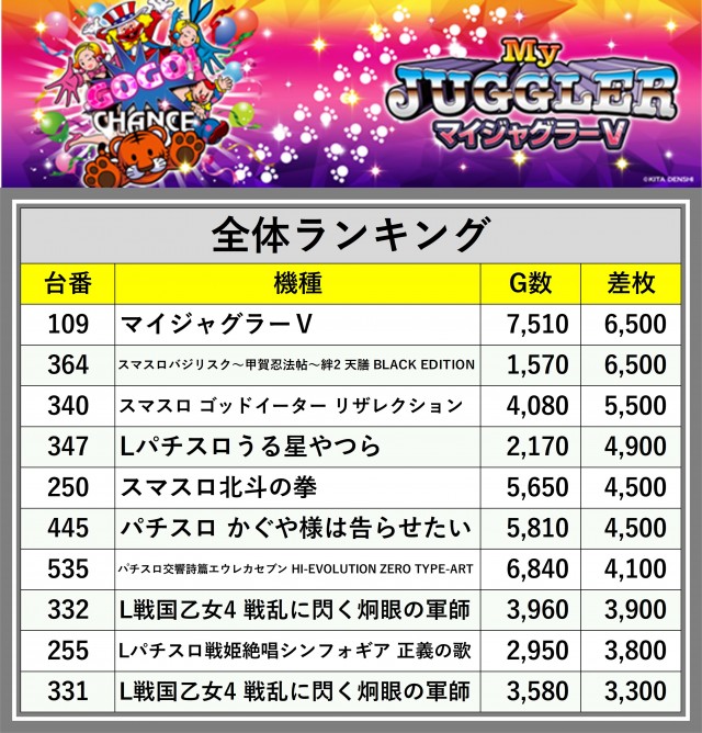 厳選された取材対象機種をはじめ、その他スロット全体から好記録が飛び出した!プレイヤーが楽しんだ1日を下記データにて振り返ってみて欲しい。