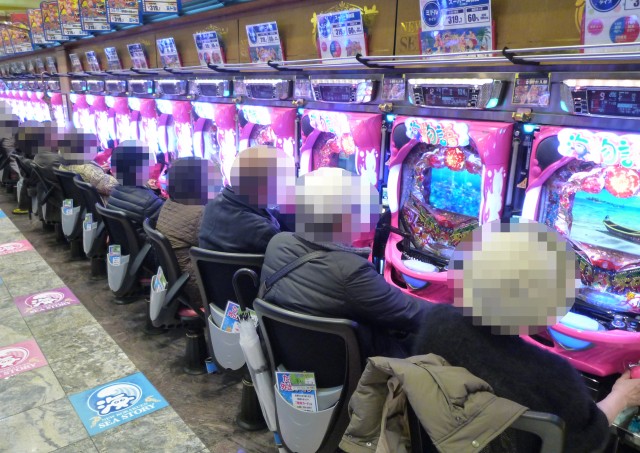 4円パチンココーナーでは、特に「CRスーパー海物語IN沖縄4マリンシェルビビッドピンクバージョン」が、高齢層のプレイヤーからの支持が厚く、のんびりと遊技を楽しむ姿があった。
