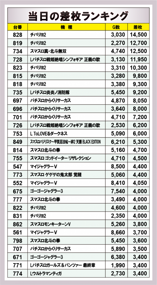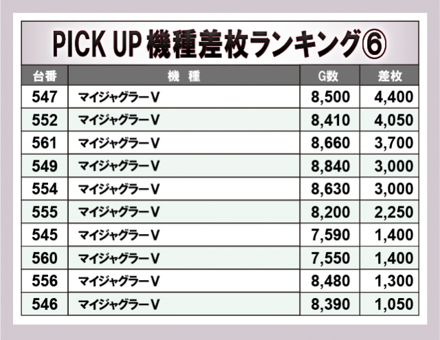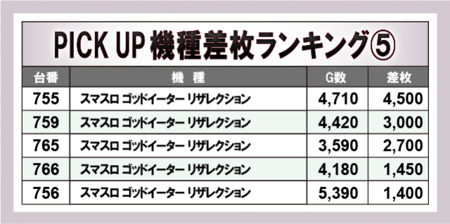上表の6機種は特に叩きがいのある状況が整っており、4桁プラス台続出という好調さを披露していたのが鮮烈だ。『スマスロ北斗の拳』などのスマスロ機だけでなく、『マイジャグラーⅤ』もコンスタントなボーナス当選を見せており、あらゆる機種が活躍していたのが見て取れる。