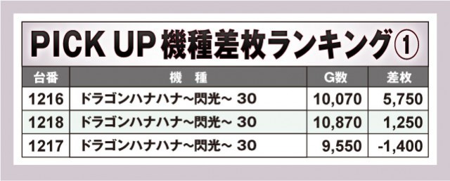 その中で傾向はと言うと、人気AT機を中心にと言ったところだろうが、『ドラゴンハナハナ~閃光~ 30』にも優秀台があるなどノーマルタイプも見逃せない。今回ピックアップした機種を頭の中に入れておいて次回の参考として欲しい。