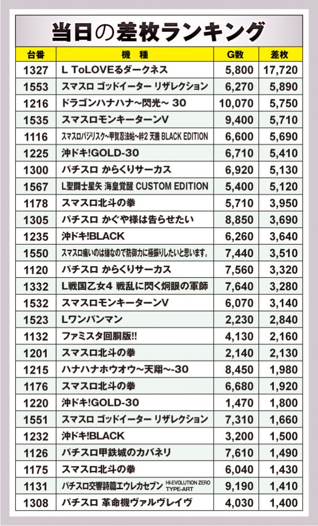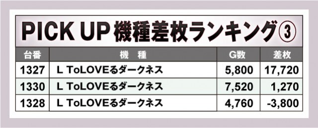 さて、気になる今回の優秀台はコチラ。トップ差枚数はまさかのコンプリート手前の出玉炸裂となった。無限の上乗せ性能を誇る『L ToLOVEるダークネス』の1327番台から17,720枚!! 完全に1台だけ抜きんでる形と相成った。