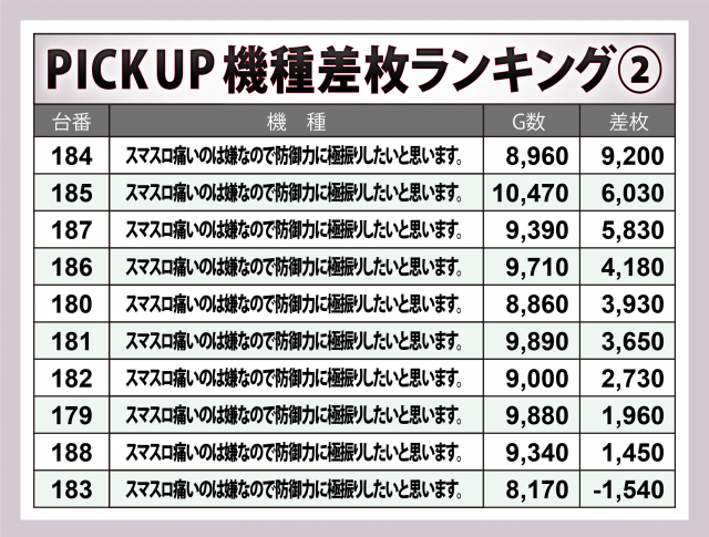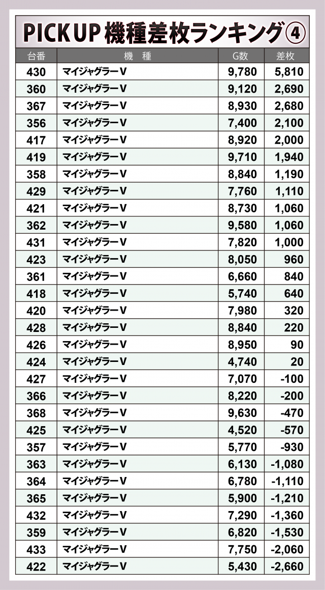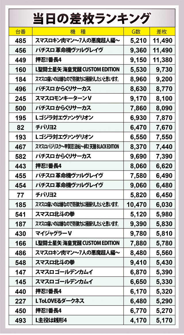まずはこの日の上位30台から。過去2回と同じく30台の全てが+5,000枚以上というグレードの高さが継続しており、+6,000枚以上は全体の6割となる18台、+7,000枚オーバーは13台、+8,000枚オーバーは8台、+9,000枚オーバーは5台、そして万枚をクリアしたのは3台と、ハイクオリティの維持が伝わってきた。