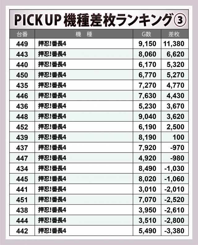 この中で際立ったのが『押忍!番長4』。+11,400枚弱を皮切りに+6,600枚超が1台・+5,000枚超&+4,000枚超&+3,000枚超が2台ずつと、シマは大きな沸きを見せた。
