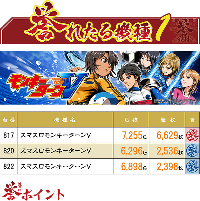 6台設置の『スマスロモンキーターンV』は、4台がプラスという好環境。さらにそのうちの3台が誉マークとなっており、中でも817番台は『モンキー』のいいところが最大限に発揮された結果となった。