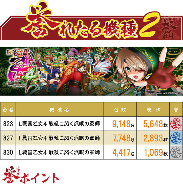 『L戦国乙女4 戦乱に閃く炯眼の軍師』からも3台の誉マーキングが飛び出した。3台ともに良好な動きを見せていたが、その中で頭3つ分ほど抜けていたのは、5,500枚超えを果たした823番台だろう。