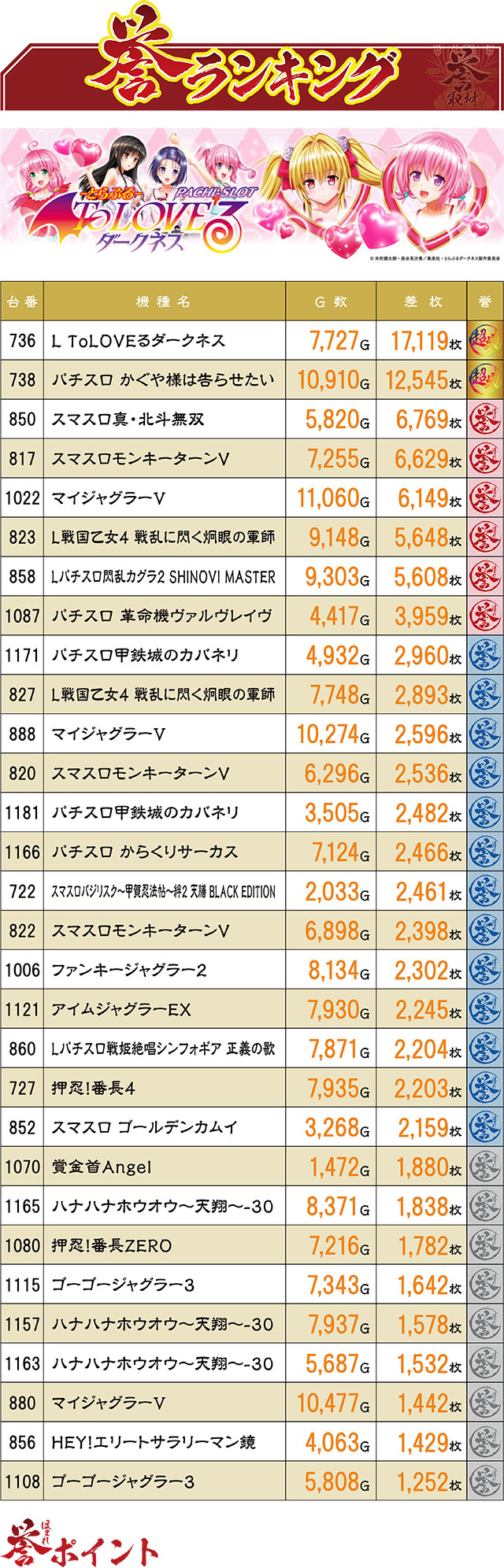 この日の10,000枚オーバー台は2台!それも『L ToLOVEるダークネス』の方は17,000枚超えというとんでもない記録だった。2位以下にはおなじみの強力マシンたちが並ぶが、その中には『Lパチスロ閃乱カグラ2 SHINOVI MASTER』『Lパチスロ戦姫絶唱シンフォギア 正義の歌』『スマスロ ゴールデンカムイ』『賞金首Angel』『HEY!エリートサラリーマン鏡』などの1~2台機種が多くランクインしていたことを付け加えておく。