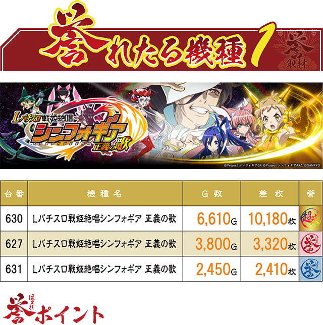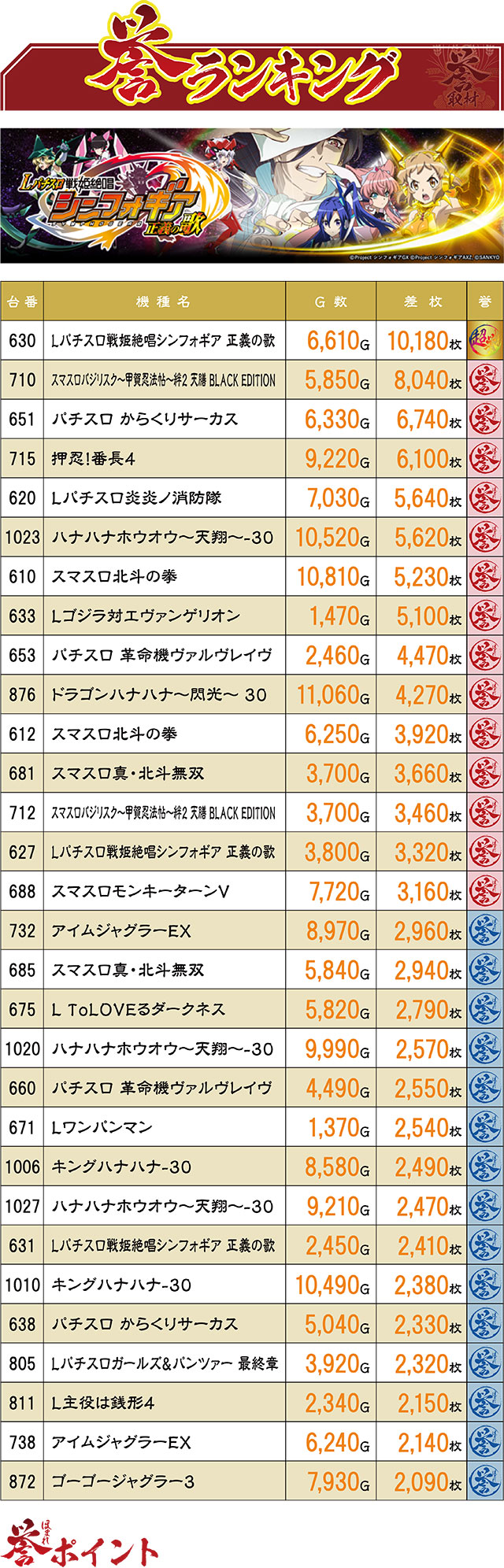この日、唯一の10,000枚超え記録にして、最高差枚記録となったのは『Lパチスロ戦姫絶唱シンフォギア 正義の歌』。『シンフォ』と『ハナハナホウオウ~天翔~-30』はともに3台ずつがTOP30にランクイン。両機種ともかなり状況が良かったのは間違いなさそうだ。