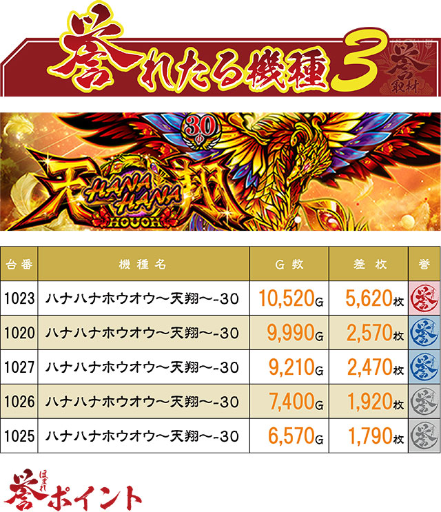15台設置の『ハナハナホウオウ~天翔~-30』は、1/3にあたる5台が誉マーキング!その中でも頭3つ分ほど飛び抜けていたのが1023番台で、ノーマル機とは思えぬボーナス連打で5,620枚という過激な結果を叩き出した。