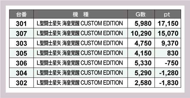 なかでも注目を集めたのが『L聖闘士星矢 海皇覚醒 CUSTOM EDITION』だ。301番台+17,150pt、307番台+15,070pt、303番台+9,370ptと圧巻の破壊力を見せつけている。