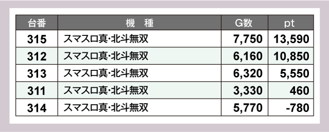 さらに『スマスロ真・北斗無双』も活況で、315番台が+13,590pt、312番台が+10,850ptと2台が1万ptオーバーを達成していた。