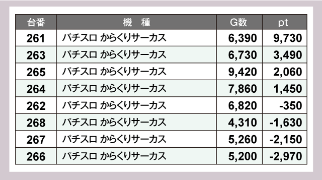 人気機種の『パチスロ からくりサーカス』も負けておらず、261番台が+9,730ptと1万pt寸前の活躍を披露していた。