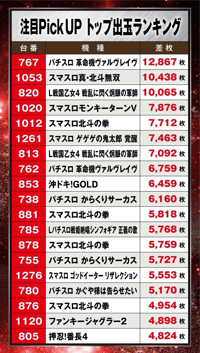 店内の様子を見てみると、人気のスマスロから万枚超が3台も出現する盛り上がりを見せており、特にランキングトップになった『パチスロ 革命機ヴァルヴレイヴ』は+12,867枚という圧巻の結果を残しいている。