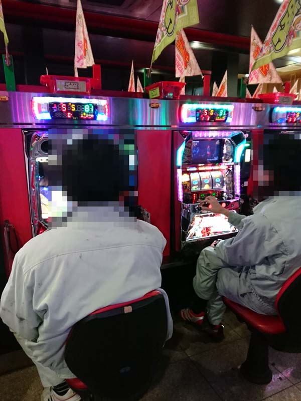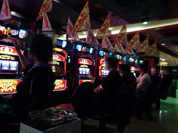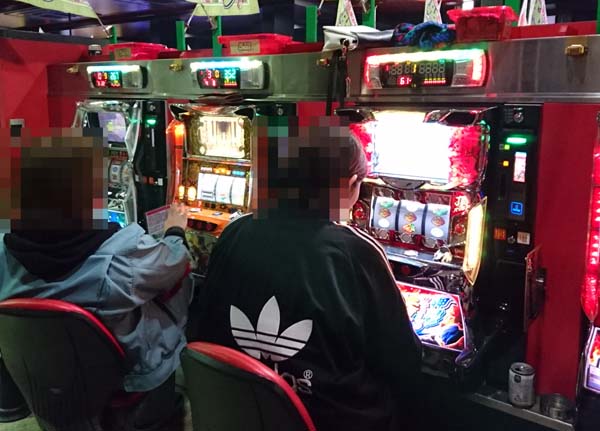 5円スロットも多彩な機種ラインナップが特徴。「押忍!サラリーマン番長」や「学園黙示録 HIGH SCHOOL OF THE DEAD」で活躍を見せるプレイヤーを確認。表情は明るく、パチスロ本来の魅力を堪能出来ている様子だった。