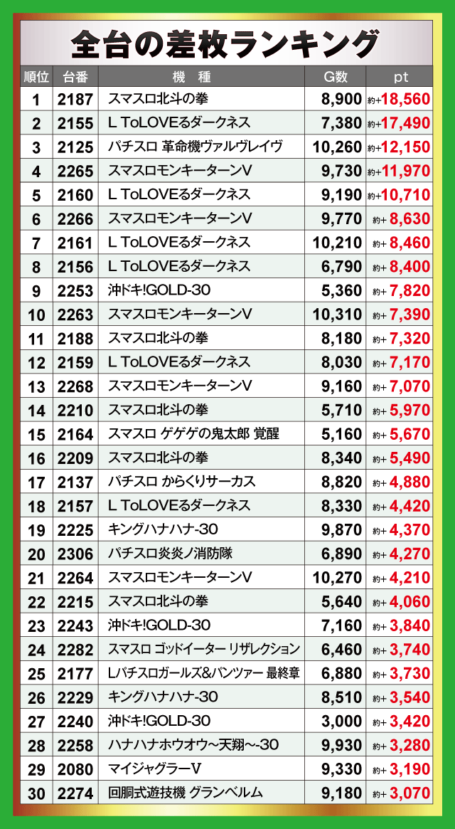 楽園沼津店は2155番台、2160番台で万枚超が出現、しかも2155番台が驚異の17,000pt超を記録し店内を盛り上げていた。