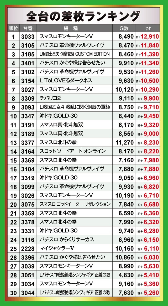 楽園上新屋店は万枚超が複数出現。そのうちの3033番台が叩き出した12,000pt超が全店舗でのナンバー1差枚となっている。