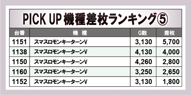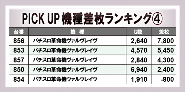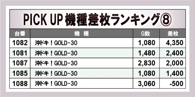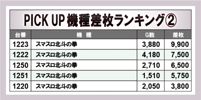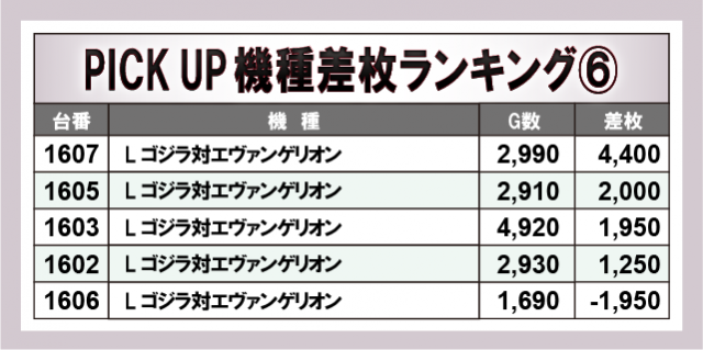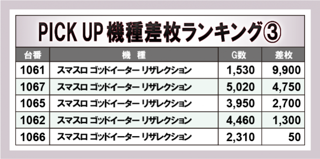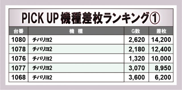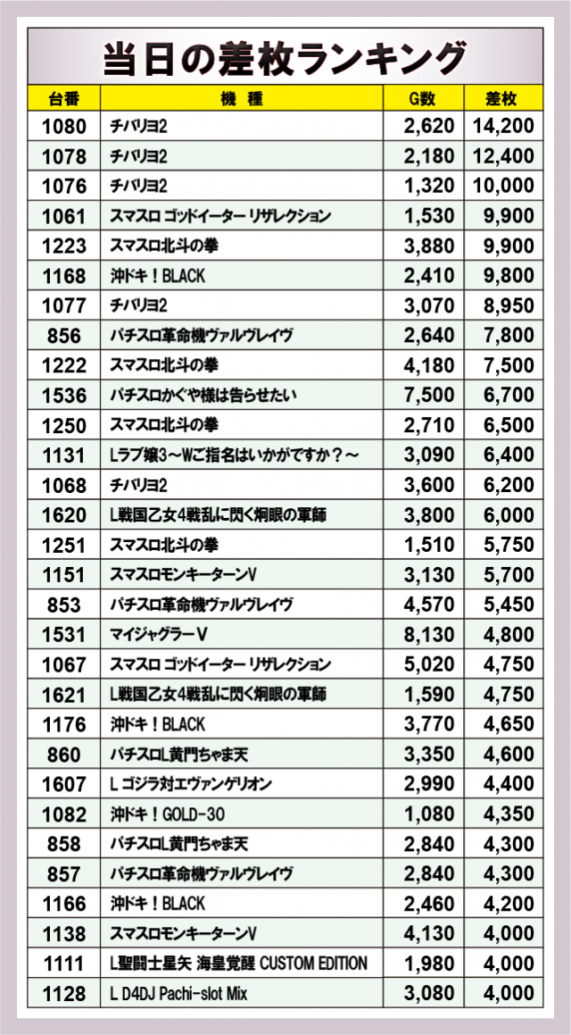 まずは当日の差枚ランキングを見てみると、『チバリヨ2』から3台の万枚OVERを記録し、ホール内を存分に盛り上げていた。また『スマスロ ゴッドイーター リザレクション』『スマスロ北斗の拳』『沖ドキ!BLACK』で万枚に届く勢いをみせていた。そのほかにも+5,000枚OVERが17台も誕生し、十分な手応えを感じたファンも多かったに違いない。